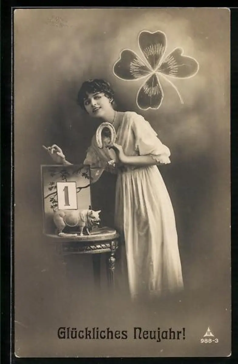 Foto-AK Photochemie Berlin Nr. 988-3: Elegante Dame steht neben einem Tisch mit Schwein und Hufeisen