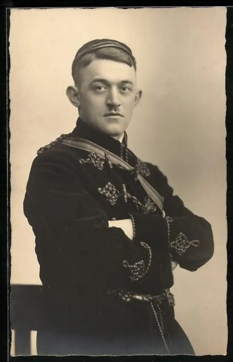Foto-AK Portrait Student in Uniform mit Verbindungsband, studentische Szene