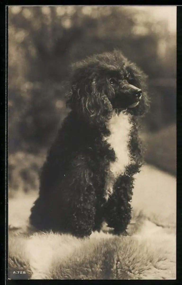 Foto-AK Pudel mit weisser Blesse auf einem Fell