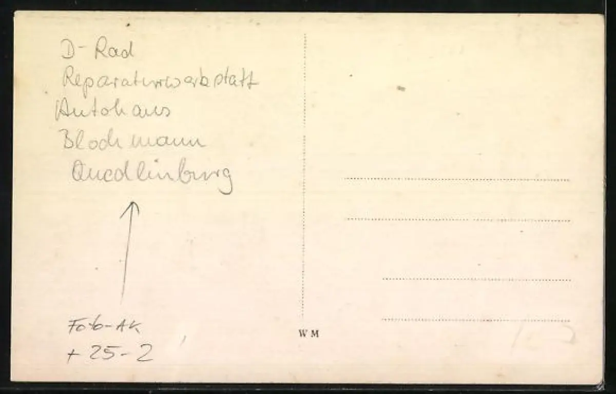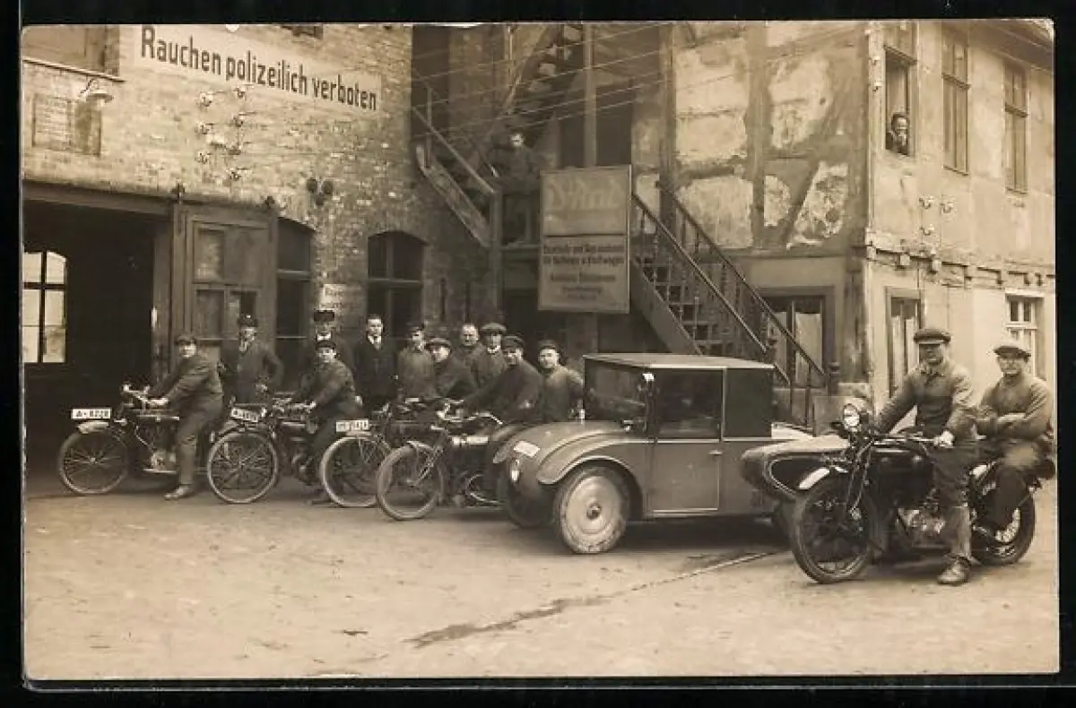 Foto-AK Quedlinburg, Reparaturwerkstatt Autohaus Blochmann, Gruppe mit Motorrädern, D-Rad