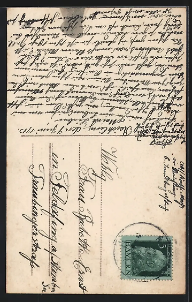 Personenbezogene Daten auf der Rückseite der Karte wurden durch blauen Textmarker unkenntlich gemacht. Die blauen Stellen sind auf die Vorderseite durchgeweicht und wirken sich negativ auf das Postkartenfoto aus