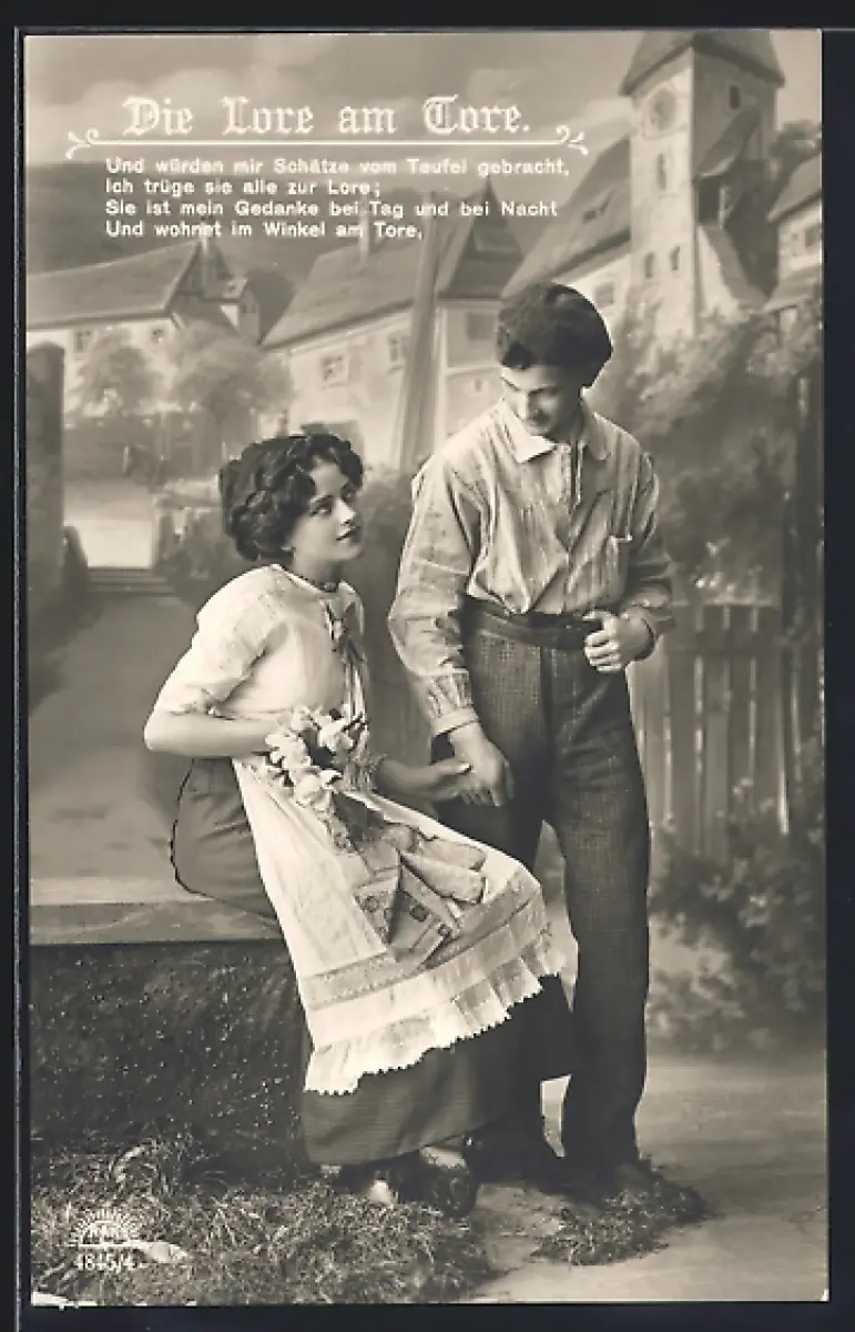 Foto-AK R & K / L Nr. 4845/4: Junges Paar vor Dorfkulisse, Die Lore am Tore