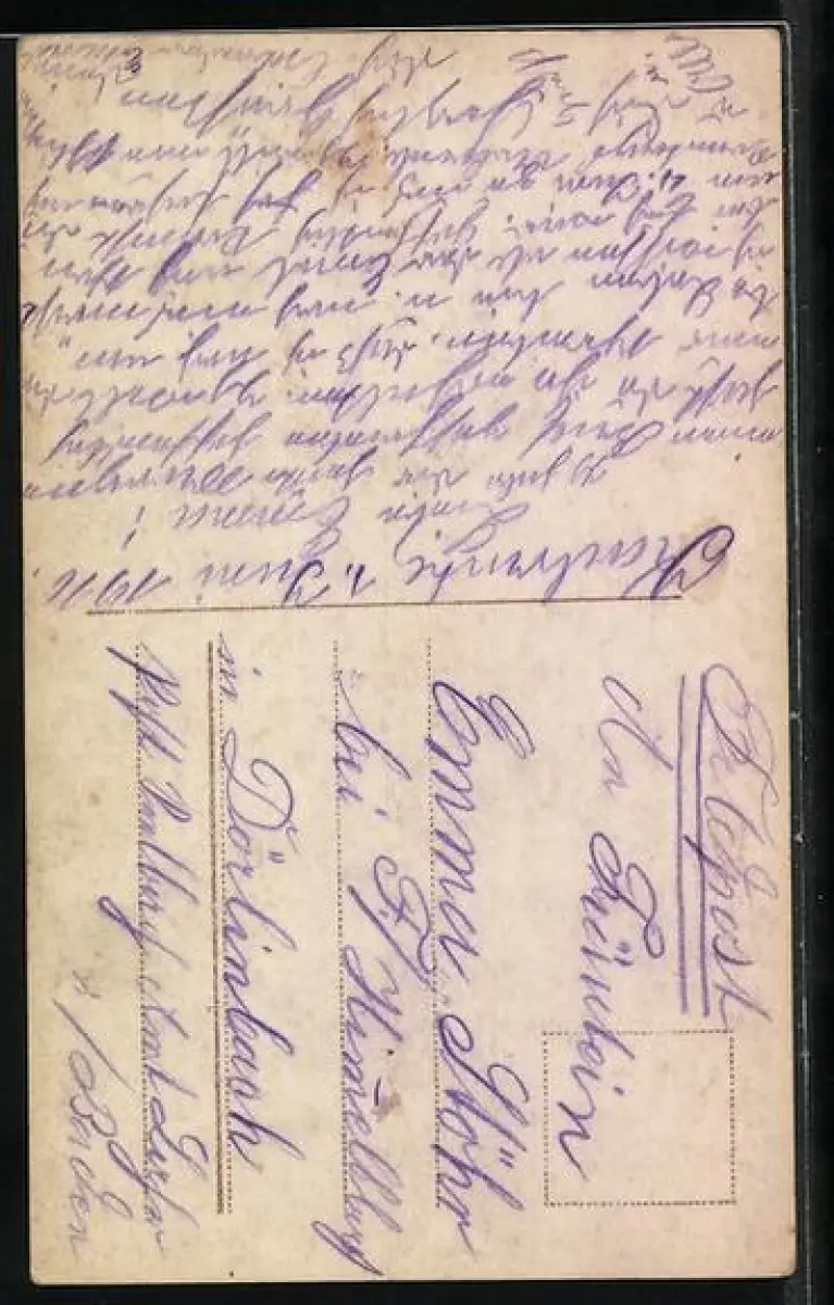 Personenbezogene Daten auf der Rückseite der Karte wurden durch blauen Textmarker unkenntlich gemacht. Die blauen Stellen sind auf die Vorderseite durchgeweicht und wirken sich negativ auf das Postkartenfoto aus