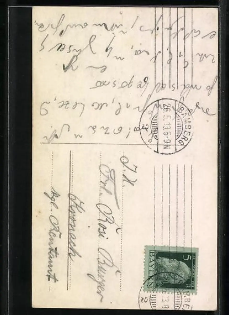 Personenbezogene Daten auf der Rückseite der Karte wurden durch blauen Textmarker unkenntlich gemacht. Die blauen Stellen sind auf die Vorderseite durchgeweicht und wirken sich negativ auf das Postkartenfoto aus