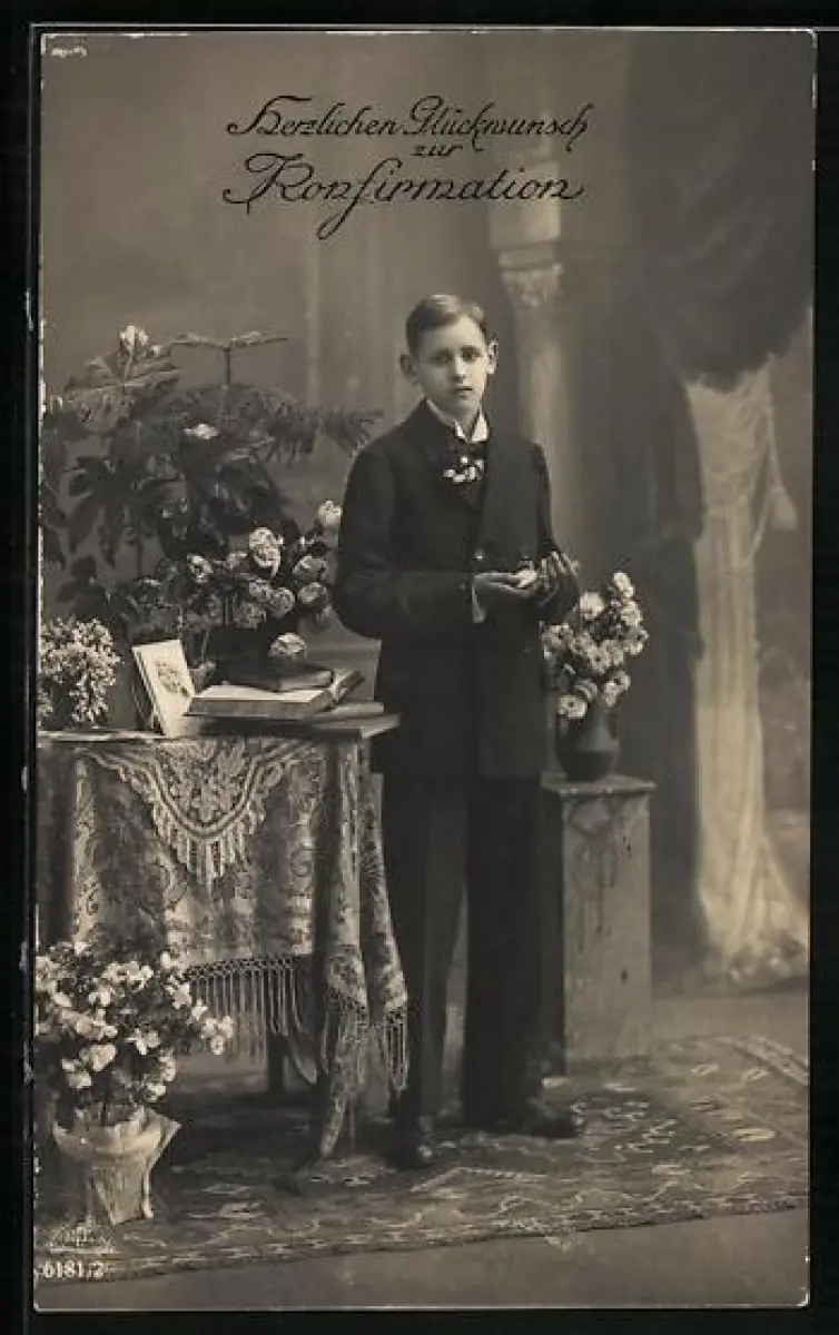 Foto-AK R & K / L Nr. 6181/2: Junge im Anzug am Konfirmationstag