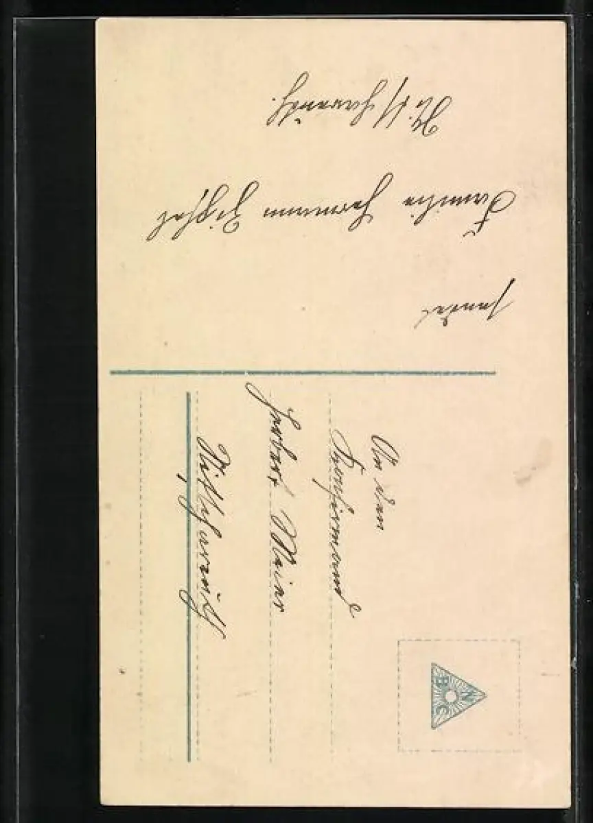 Personenbezogene Daten auf der Rückseite der Karte wurden durch blauen Textmarker unkenntlich gemacht. Die blauen Stellen sind auf die Vorderseite durchgeweicht und wirken sich negativ auf das Postkartenfoto aus