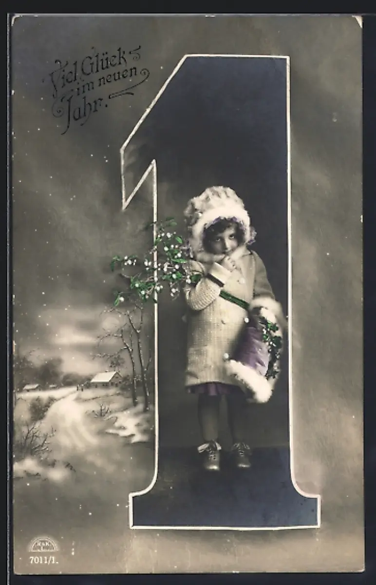 Foto-AK R & K / L Nr. 7011/1: Kind in Winterkleidung mit Mistelzwei in der Zahl 1, Neujahr