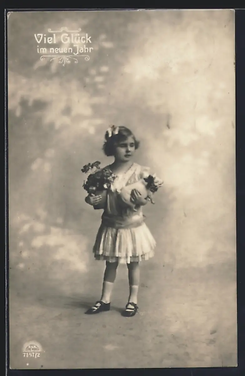 Foto-AK R & K / L Nr. 7157/2: Mädchen mit Schwein und Klee, Neujahr
