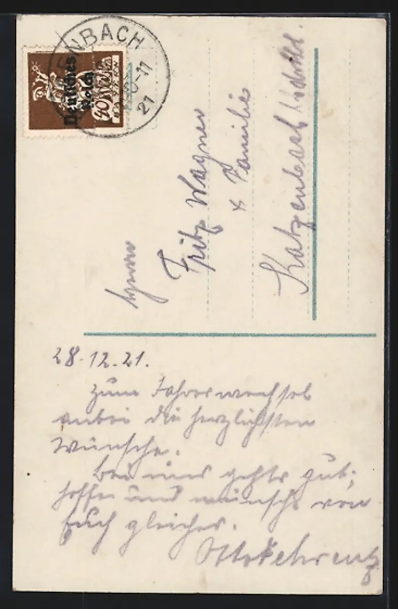 Personenbezogene Daten auf der Rückseite der Karte wurden durch blauen Textmarker unkenntlich gemacht. Die blauen Stellen sind auf die Vorderseite durchgeweicht und wirken sich negativ auf das Postkartenfoto aus