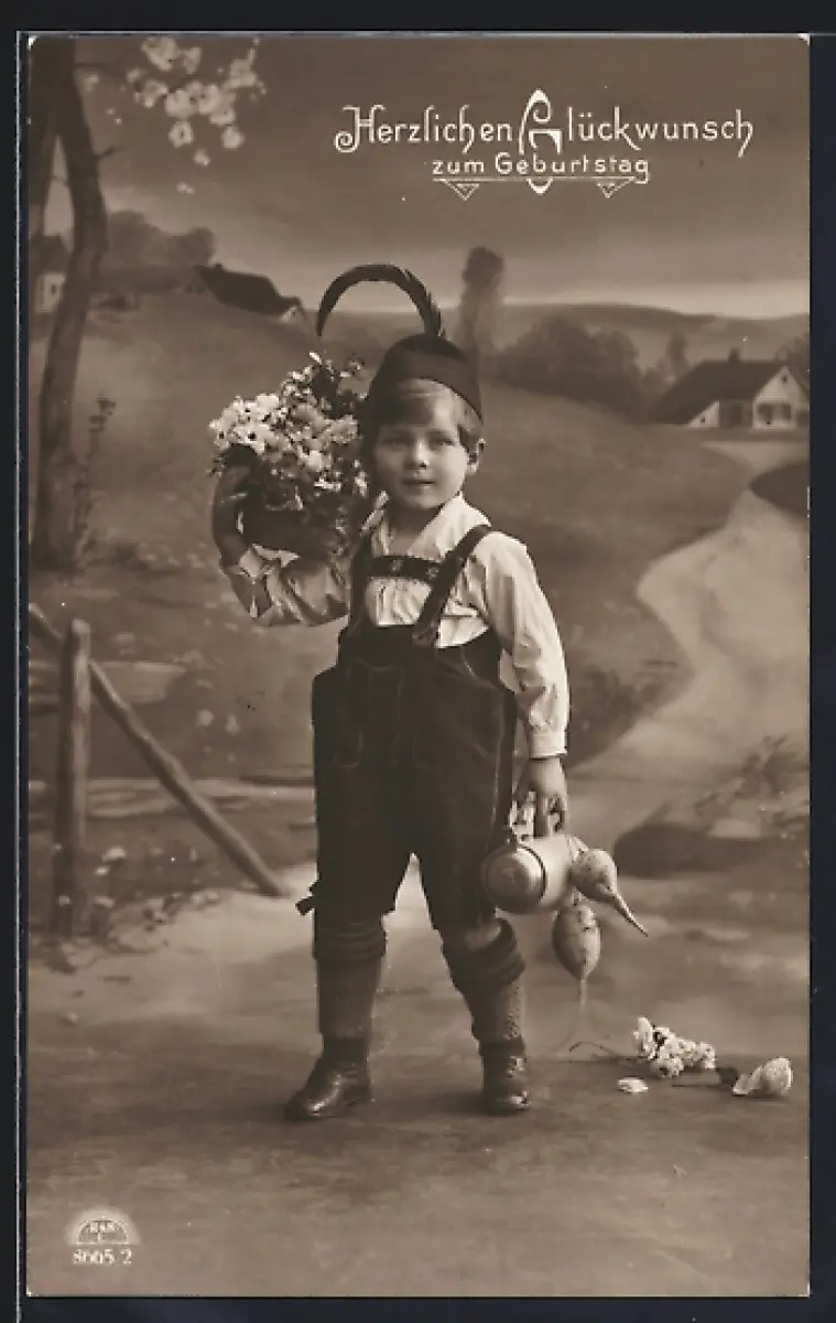 Foto-AK R & K / L Nr. 8665/2: Junge mit Blumenkorb und Rüben, Geburtstag