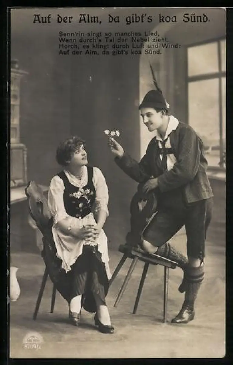 Foto-AK R & K / L Nr. 8709/2: Wandersmann überreicht junger Frau Edelweissblüten