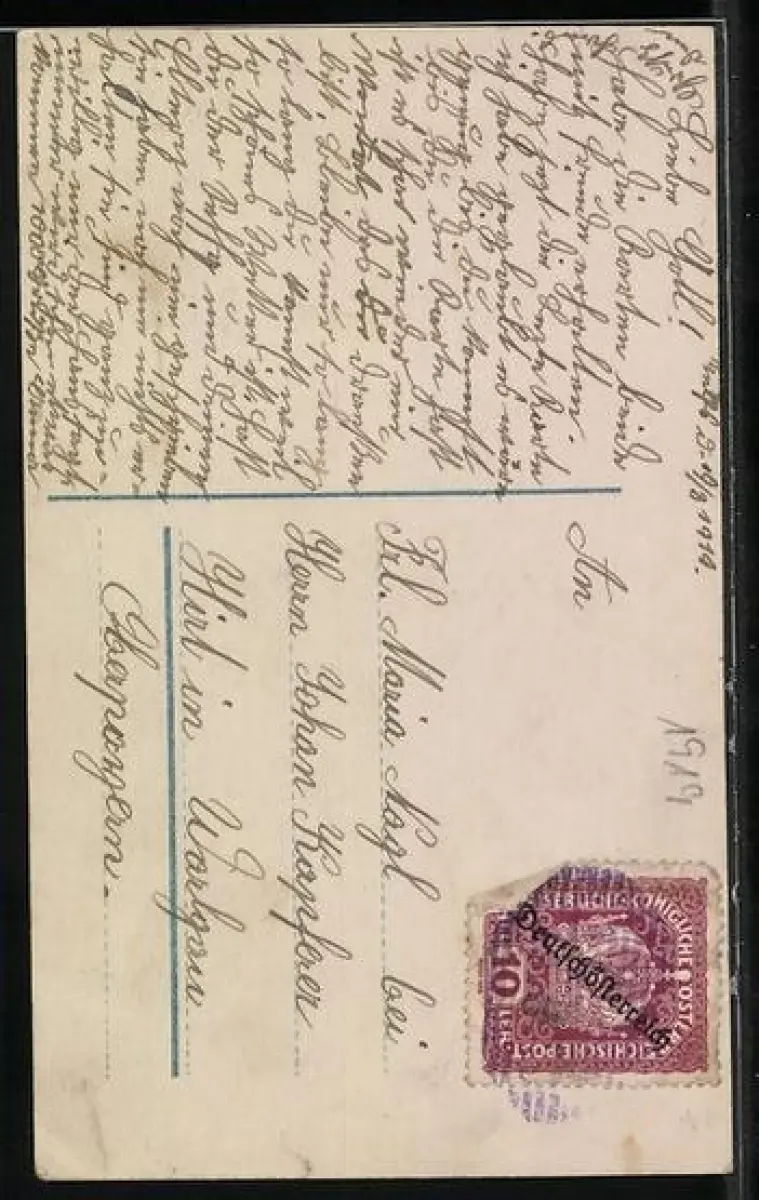 Personenbezogene Daten auf der Rückseite der Karte wurden durch blauen Textmarker unkenntlich gemacht. Die blauen Stellen sind auf die Vorderseite durchgeweicht und wirken sich negativ auf das Postkartenfoto aus