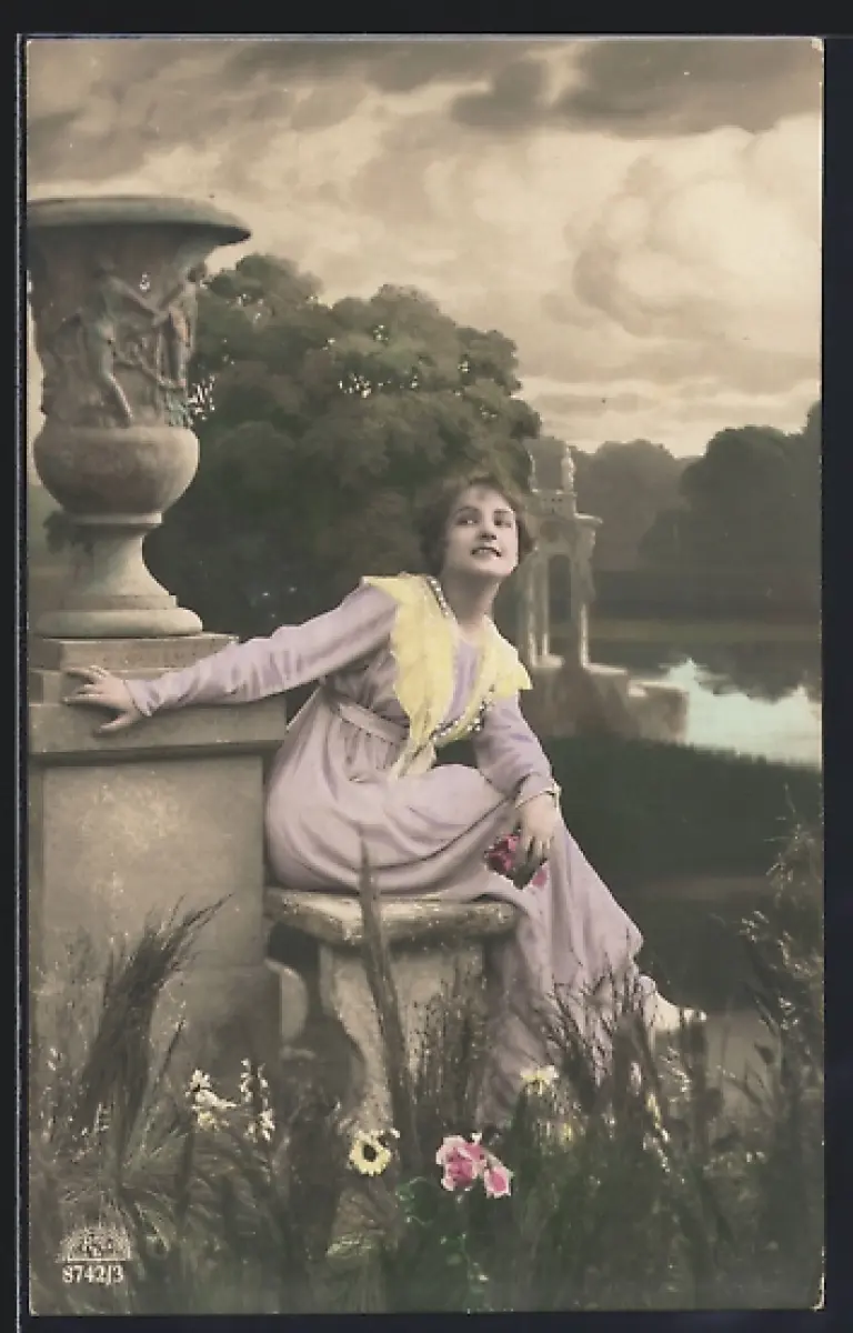Foto-AK R & K / L Nr. 8742/3: Frau sitzt auf einer Bank
