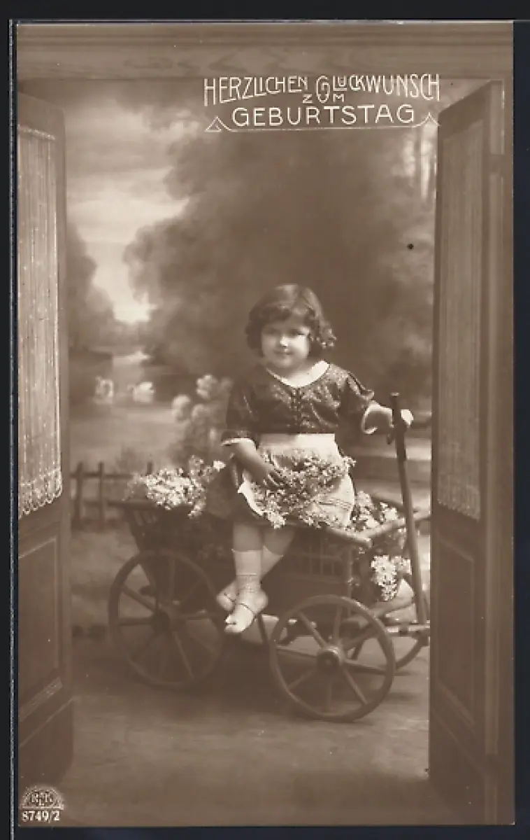 Foto-AK R & K / L Nr. 8749/2: Mädchen sitzt auf einem Wagen mit Blumen, Geburtstag