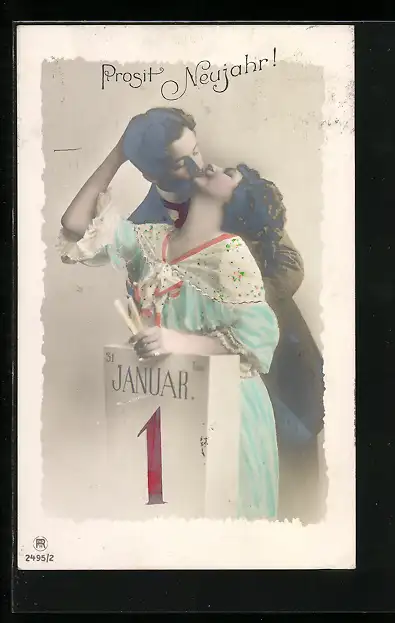 Foto-AK RPH Nr. 2495 /2: Paar küsst sich über einem Kalenderblatt, Prosit Neujahr