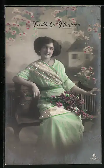 Foto-AK RPH Nr. 3365 /3: Dame sitzt mit Blumen auf einer Bank, Fröhliche Pfingsten