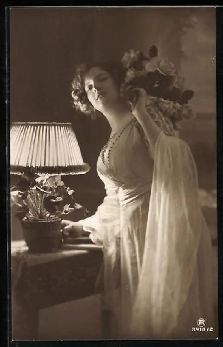 Foto-AK RPH Nr. 3418/2: Dame an einer Lampe stehend mit Blumen