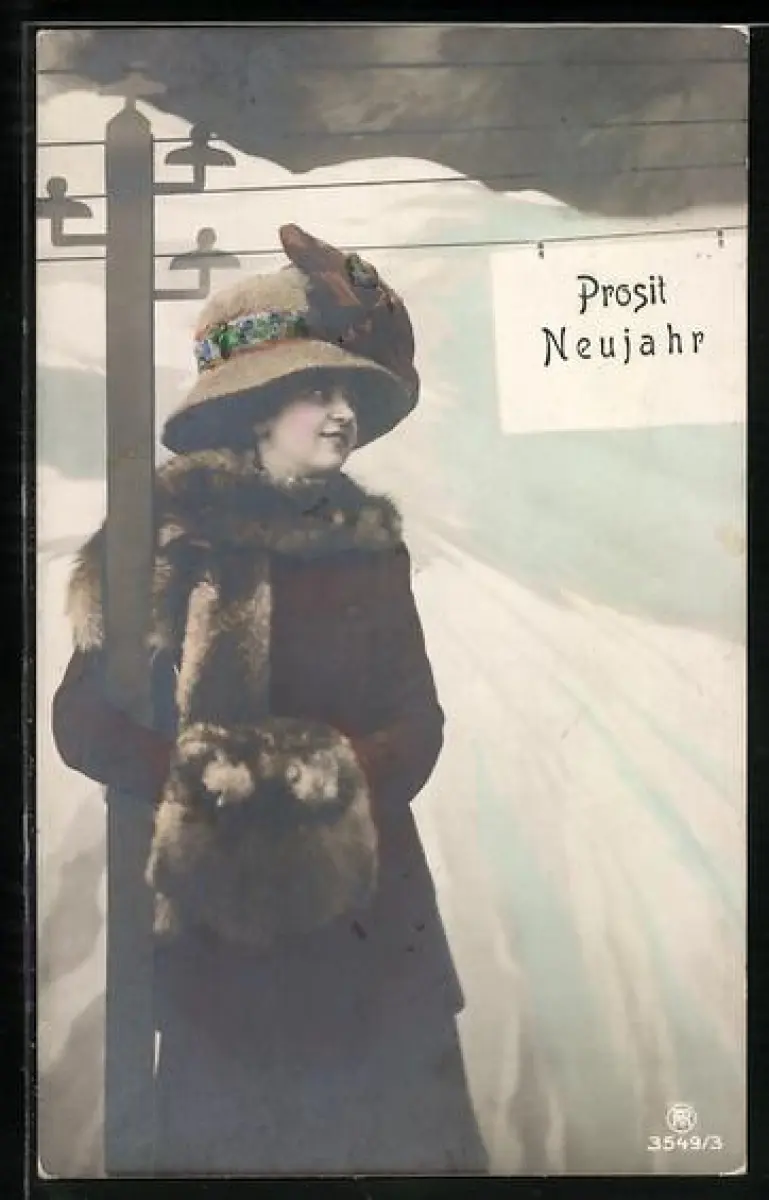 Foto-AK RPH Nr. 3549/3: Dame in Winterkleidung an einem Telefonmast