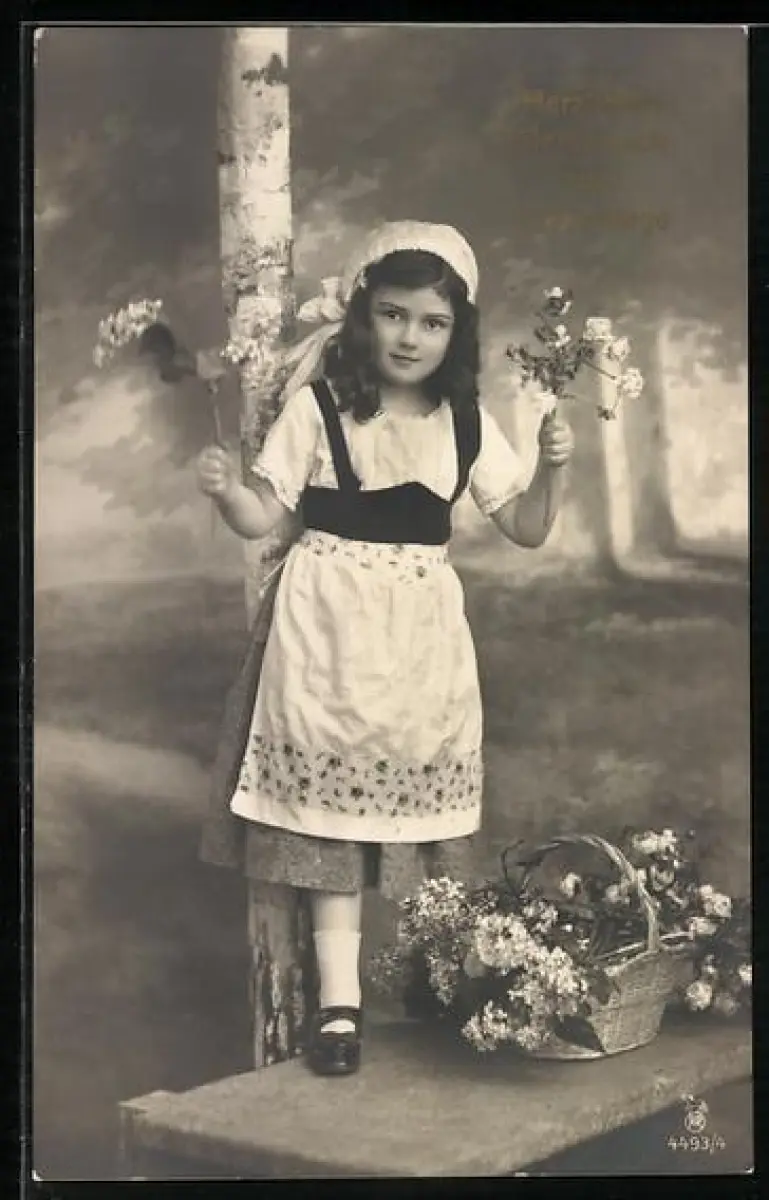 Foto-AK RPH Nr. 4493/4: Mädchen an einer Birke mit Blumen