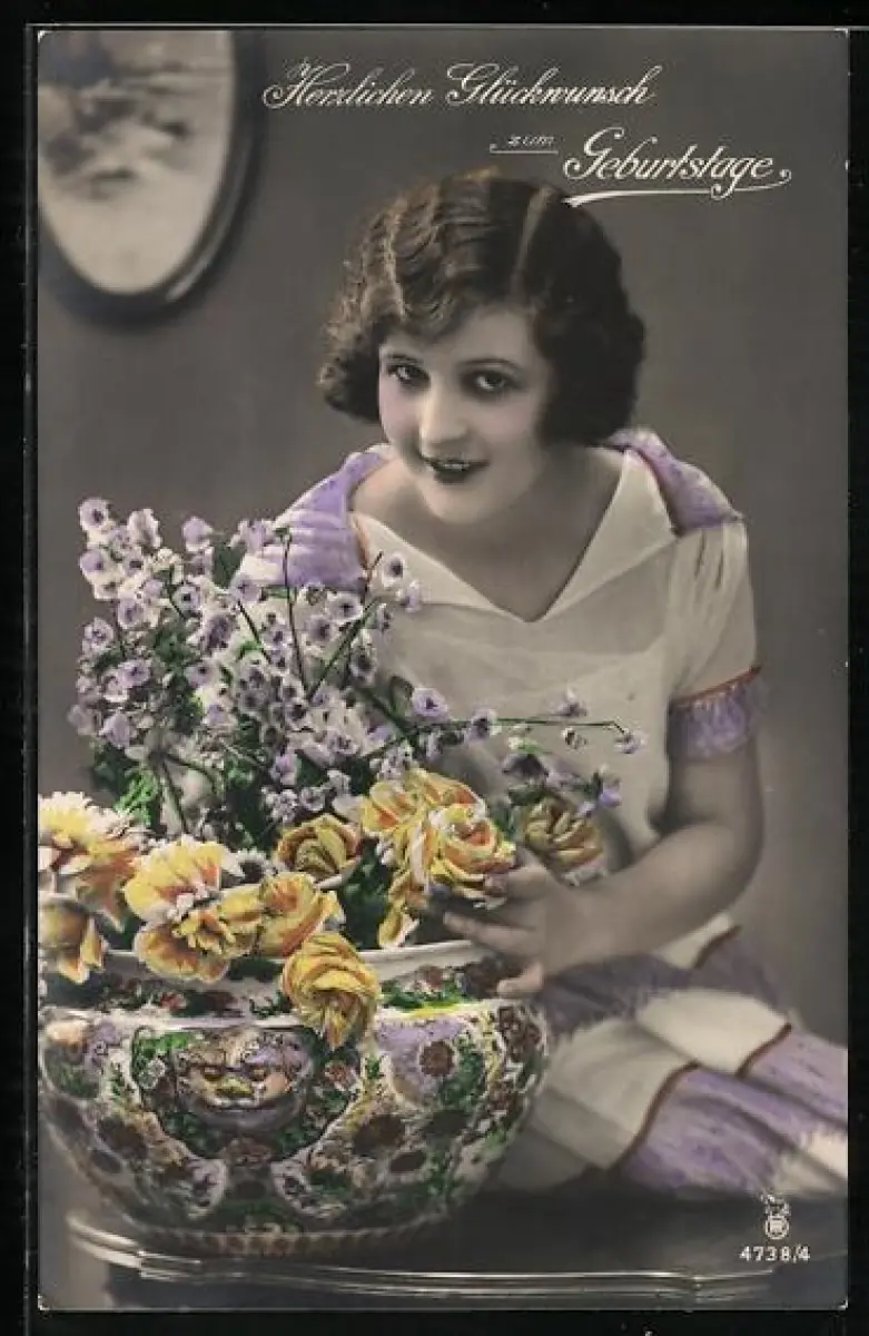 Foto-AK RPH Nr. 4738-4: Junge Frau in weiss-violettem Kleid mit einer gefüllten Blumenvase