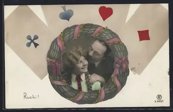 Foto-AK RPH Nr. S-965 /1: Fräulein mit einem Herrn im Kranz, Spielkarten
