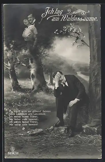 Foto-AK RPH SBW: Mann sitzt im Wald und weint heisse Tränen, Mann mit Frau vereint