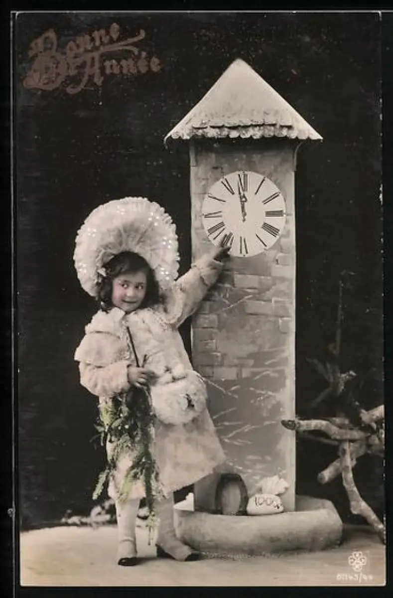 Foto-AK RPH SBW Nr. 01143/44: Mädchen um Mitternacht an Turmuhr, Neujahrsgruss