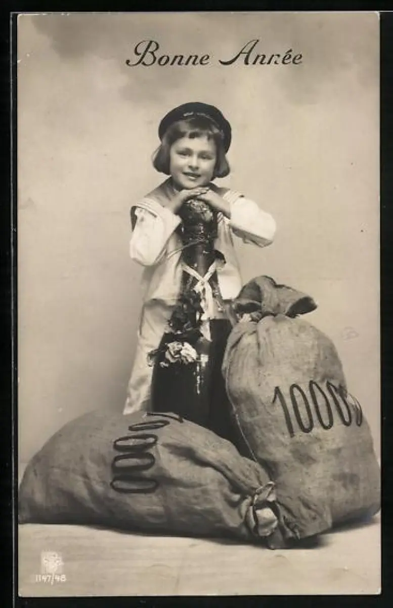 Foto-AK RPH SBW Nr. 1147/48: Junge mit Sektflasche und Geldsäcken, Neujahrsgruss