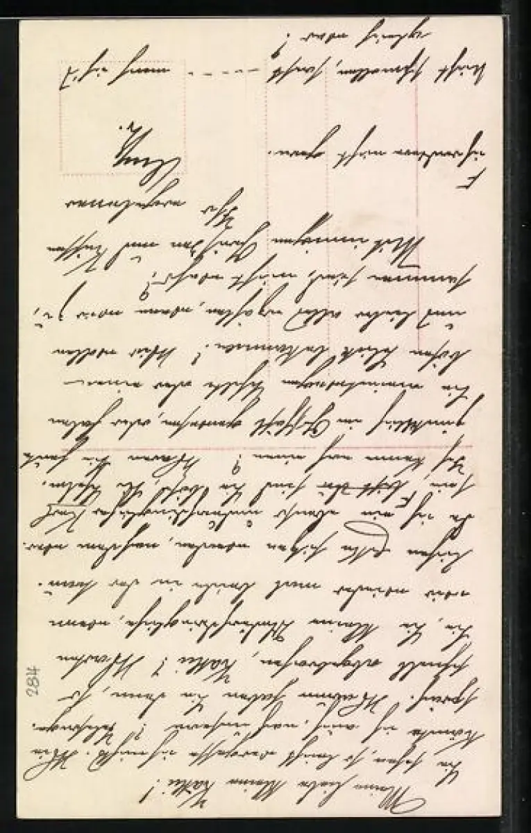 Personenbezogene Daten auf der Rückseite der Karte wurden durch blauen Textmarker unkenntlich gemacht. Die blauen Stellen sind auf die Vorderseite durchgeweicht und wirken sich negativ auf das Postkartenfoto aus