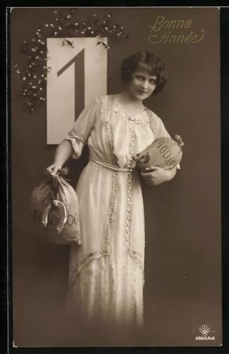 Foto-AK RPH SBW Nr. 5865/66: Frau mit Geldsäcken vor Kalender, Neujahrsgruss