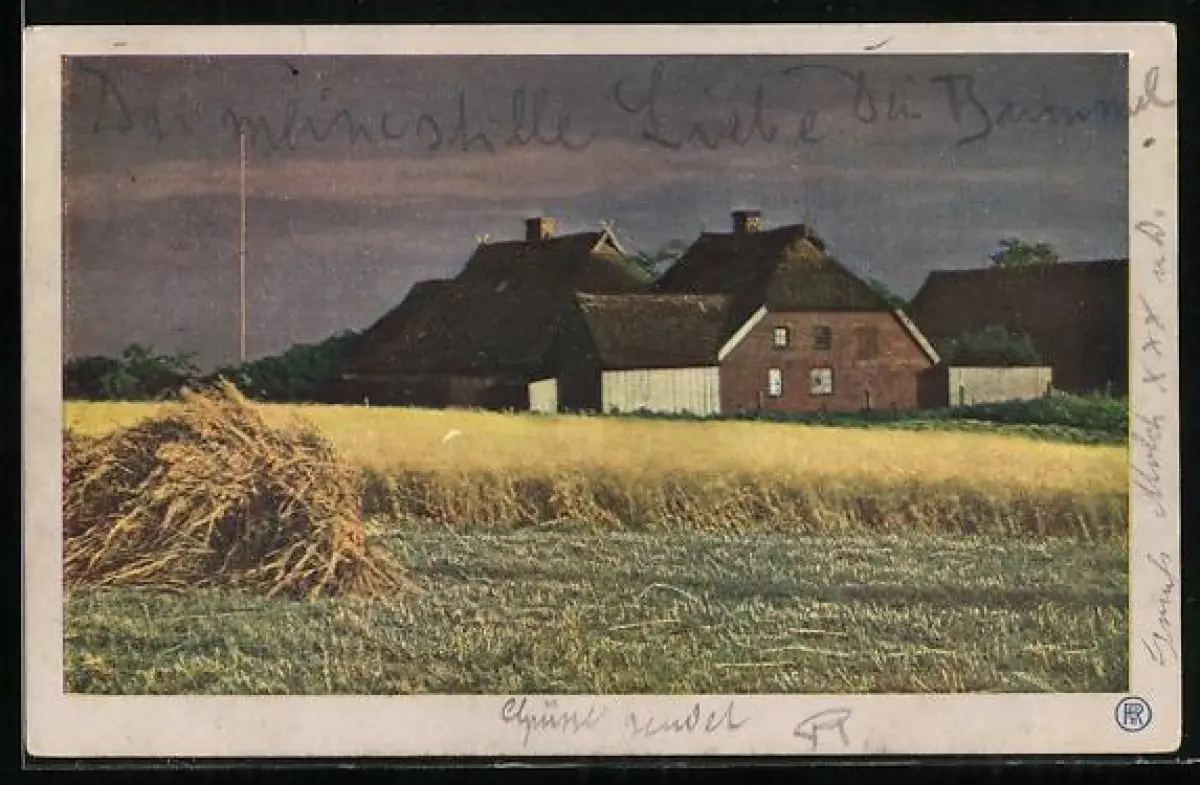 Foto-AK RPH: Stürmischer Abend, Häuser hinter einem Feld