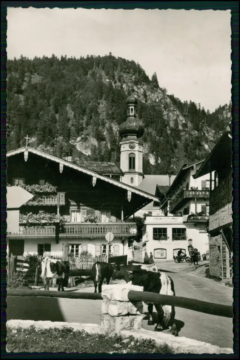 Reit im Winkl im bayerischen Chiemgau – malerisches Dorf mit traditioneller alpenländischer Architektur, Blumenschmuck und der markanten Pfarrkirche St. Pankratius im Hintergrund. Im Vordergrund Kühe auf der Dorfstraße, ein typisches Motiv des bäuerlichen Lebens in den bayerischen Alpen. Der Ort liegt nahe der Grenze zu Tirol und ist bekannt für seine Sommerfrische, Skigebiete und den Heimatfilm-Charme der 1950er-Jahre