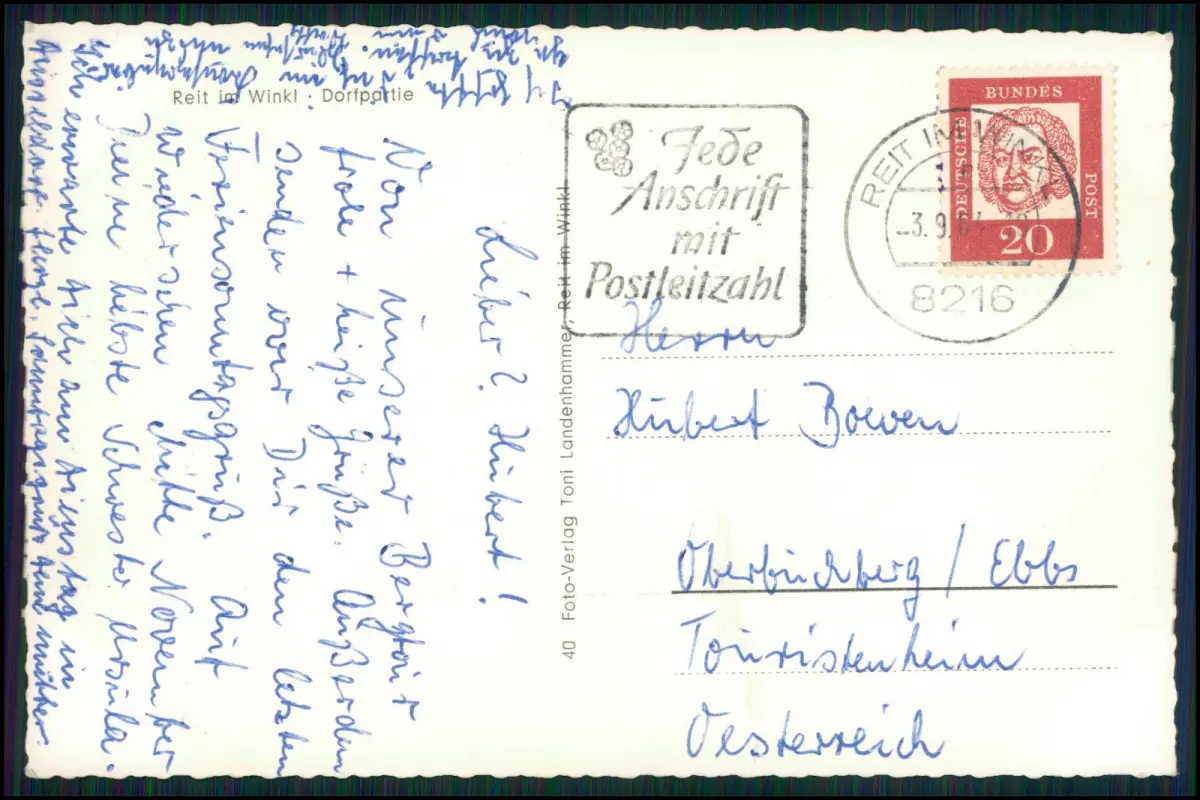 Rückseite: Gelaufen 1964, Stempel Reit im Winkl, mit Briefmarke „Deutsche Bundespost 20 Pfennig“.