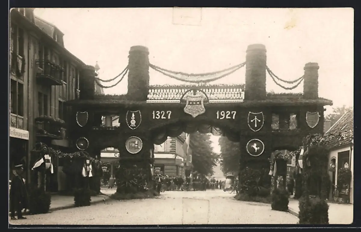 Foto-AK Rheine, Festpforte zum Jubiläumsfest 1927