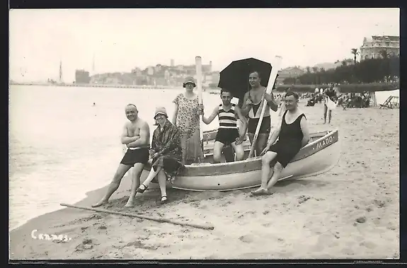 Foto-AK Rudergruppe in Badekleidung mit Boot am Strand