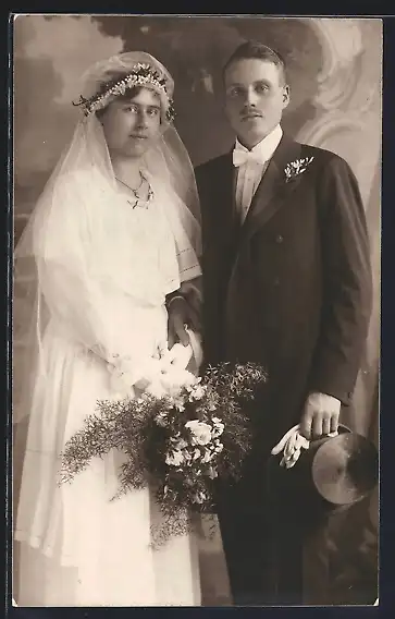 Foto-AK Rudolf Eibler im Anzug nebst seiner Frau im Brautkleid, Hochzeit