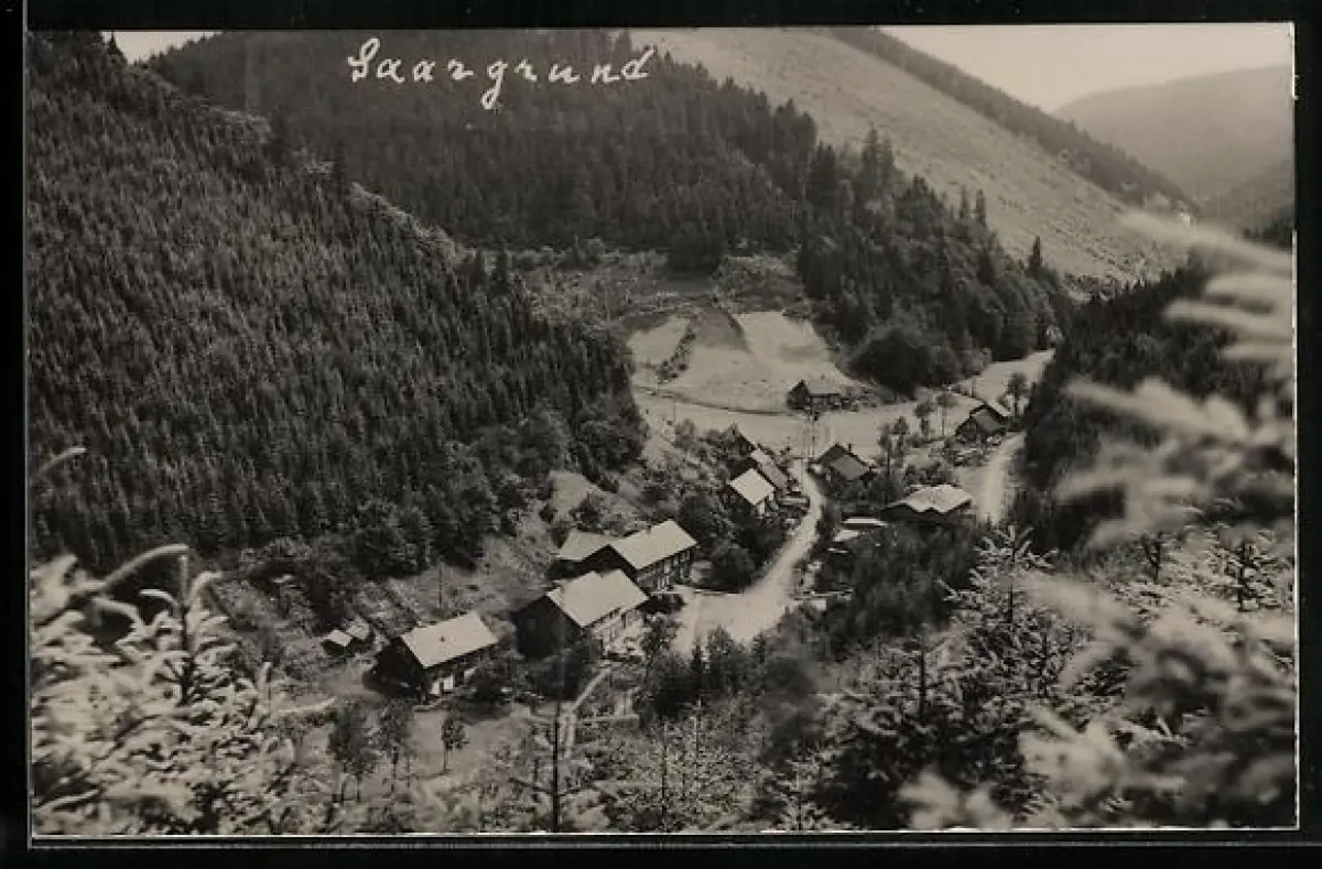 Foto-AK Saargrund, Ortsansicht im Tal umgeben von Wald und Bergen