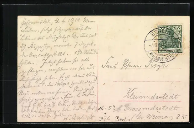 Personenbezogene Daten auf der Rückseite der Karte wurden durch blauen Textmarker unkenntlich gemacht. Die blauen Stellen sind auf die Vorderseite durchgeweicht und wirken sich negativ auf das Postkartenfoto aus