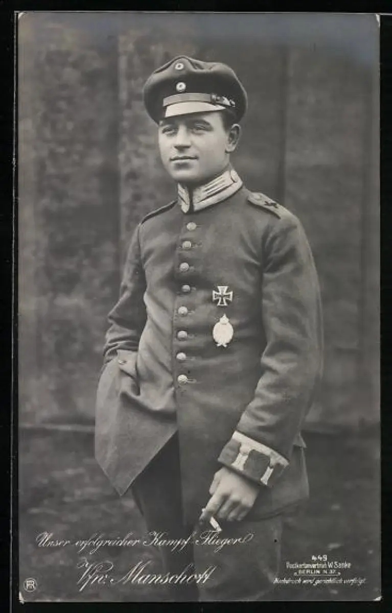 Foto-AK Sanke Nr. 449: Kampfflieger Vizefeldwebel Manschott in Uniform mit Flugzeugführerabzeichen und EK I