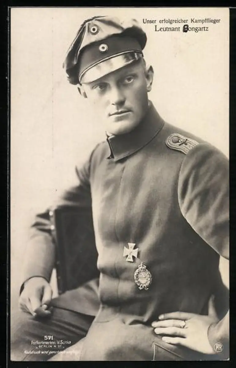 Foto-AK Sanke Nr. 571: Kampfflieger Leutnant Bongartz in Uniform mit Flugzeugführerabzeichen und EK