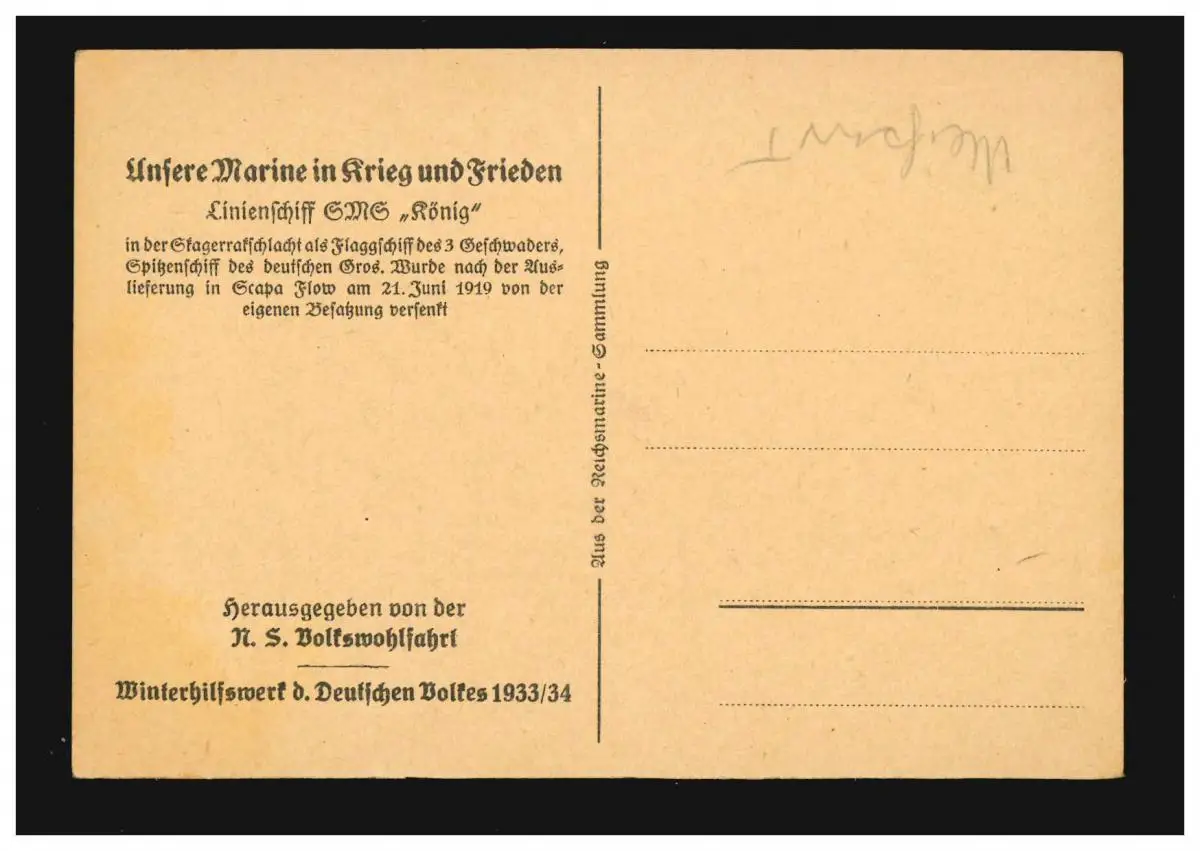Serie Unsere Marine in Krieg und Frieden / Winterhilfswerk des Deutschen Volkes 1933/34: Linienschiff SMS "König" am 21. Juni 1919 von der eigenen Besatzung versenkt