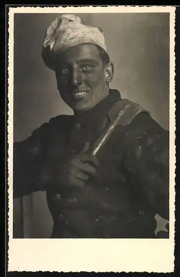 Foto-AK Schornsteinfeger in Uniform mit verrusstem Gesicht