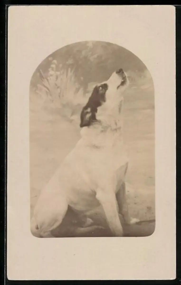 Foto-AK Sitzender Hund blickt nach oben, Portrait