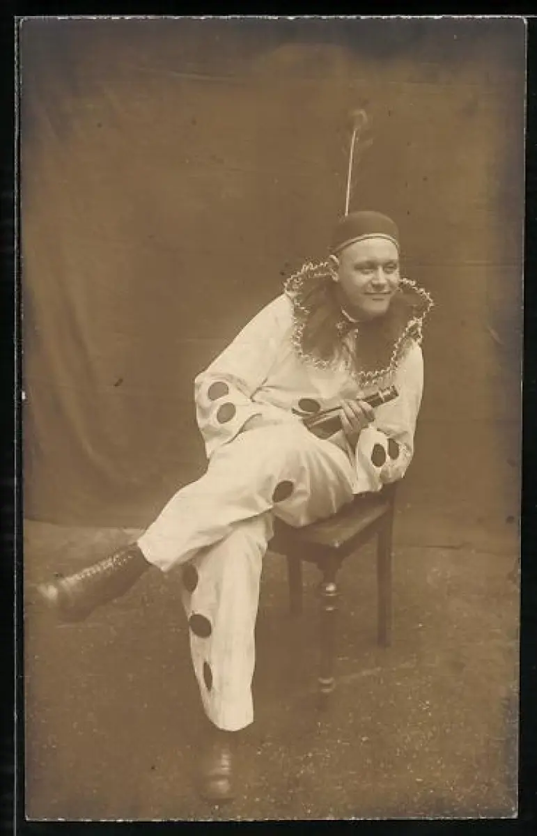Foto-AK Sitzender Narr mit Sektflasche
