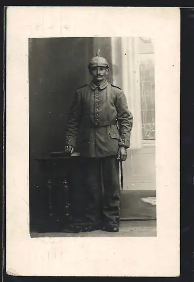 Foto-AK Soldat Sebastian Wendel in Feldgrau Uniform 18. Bay. Inf.-Rgt. 1 Ers. Batl. 5, Pickelhaube Tarnbezug