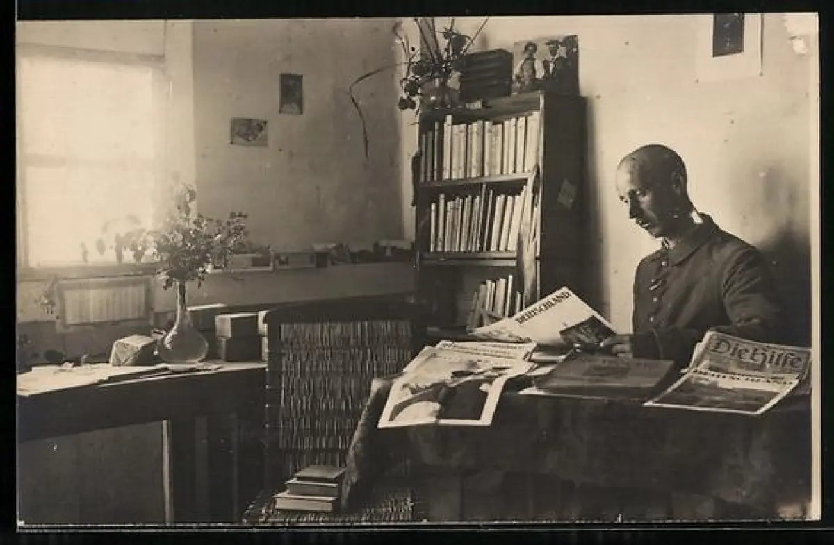 Foto-AK Soldat beim Lesen der Zeitung Die Woche, Jugendstil