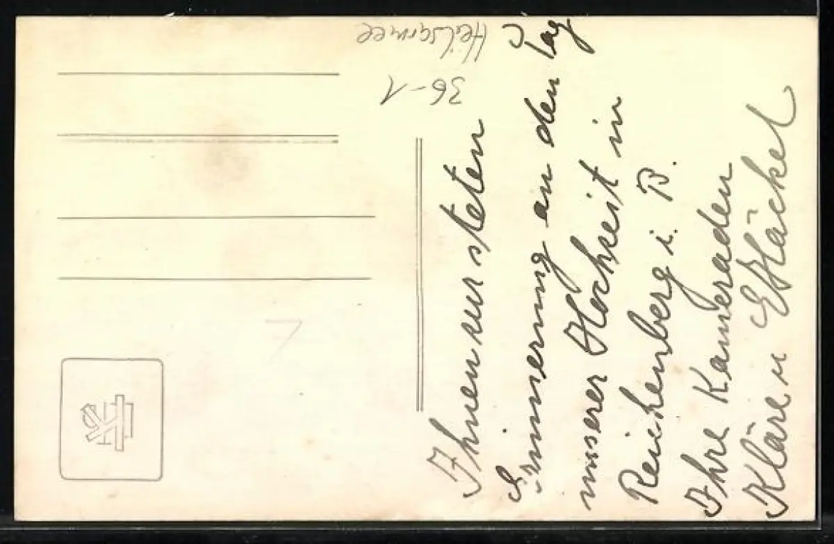 Personenbezogene Daten auf der Rückseite der Karte wurden durch blauen Textmarker unkenntlich gemacht. Die blauen Stellen sind auf die Vorderseite durchgeweicht und wirken sich negativ auf das Postkartenfoto aus