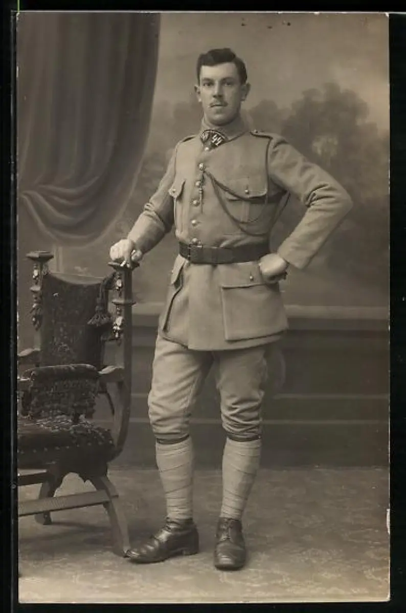 Foto-AK Soldat in Uniform Reg. No. 44 in einer Studiokulisse