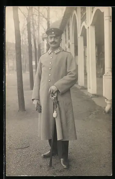 Foto-AK Soldat in Uniformmantel mit Säbel