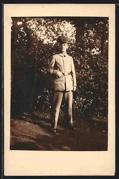 Foto-AK Soldat in schlichter Feldgrau Uniform mit Schirmhut